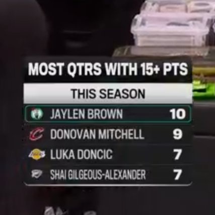 杰伦·布朗赛季10次单节15分联盟最多 米切尔9次、东契奇&SGA7次