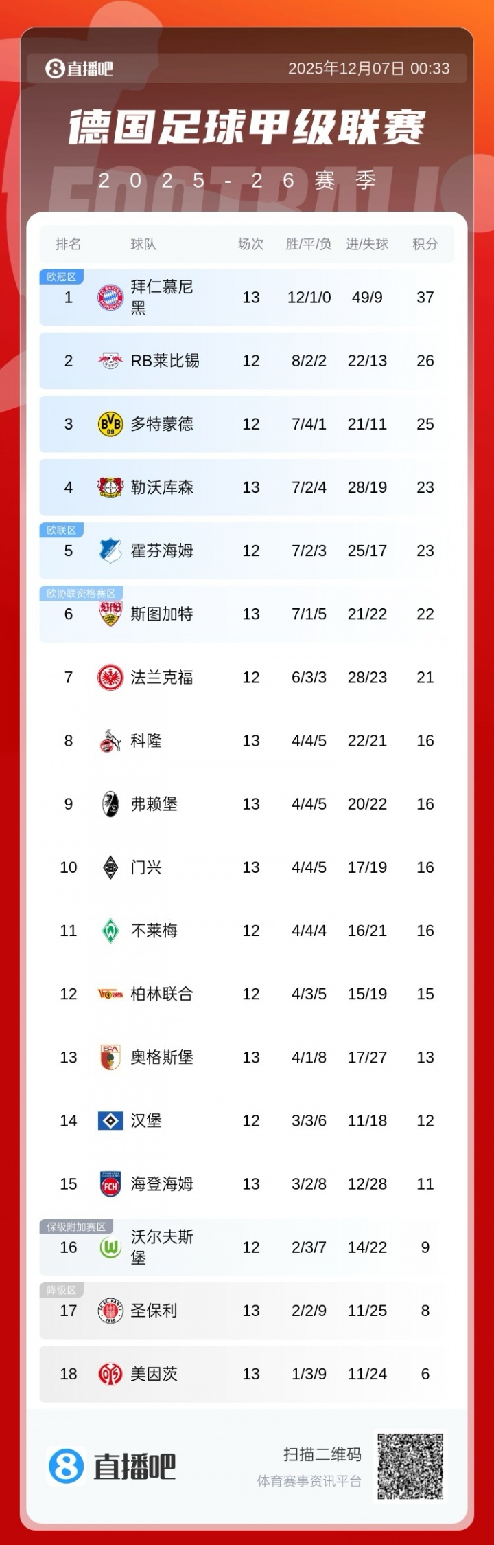 12月07日讯 德甲第13轮,拜仁5-0大胜斯图加特,本场过后,拜仁先赛11分领跑,13轮12胜狂轰49球,继续保持不败。