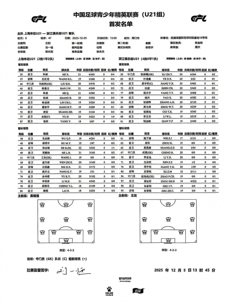 12月5日15:00 ,2025中国足球青少年精英联赛(U21组)决赛阶段第6轮上海申花对阵浙江俱乐部的比赛在海口观澜湖国际足球训练基地进行。比赛第34分钟,浙江队率先破门。第 61分钟,对手扩大领先优势。最终上海申花0-2告负。