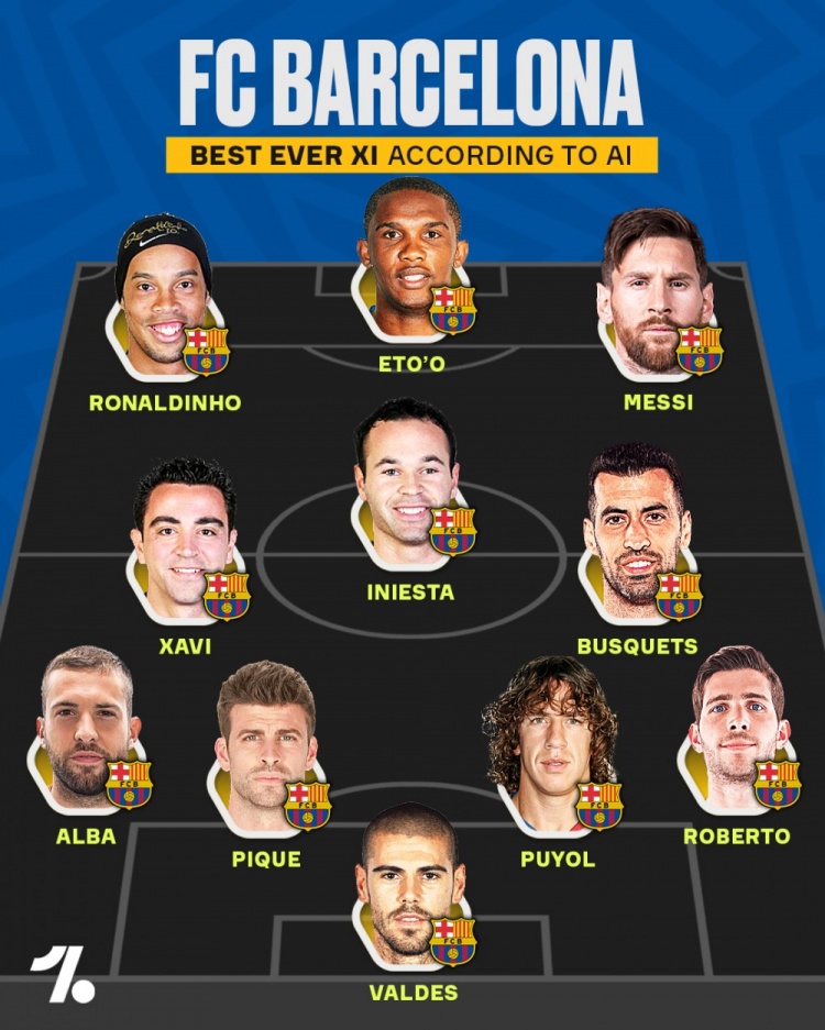 12月6日讯 Onefootball社媒晒AI评出的巴萨队史最佳阵容,梅西、小罗、埃托奥组成锋线三叉戟。